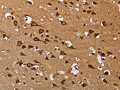 The image on the left is immunohistochemistry of paraffin-embedded Human brain tissue using CSB-PA980670(EPOR Antibody) at dilution 1/40, on the right is treated with synthetic peptide. (Original magnification: ×200)