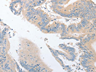 The image on the left is immunohistochemistry of paraffin-embedded Human colon cancer tissue using CSB-PA524180(EPS15L1 Antibody) at dilution 1/30, on the right is treated with fusion protein. (Original magnification: ×200)