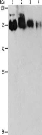 Gel: 8%SDS-PAGE, Lysate: 40 μg, Lane 1-4: Hela cells, PC3 cells, 231 cells, 293T cells, Primary antibody: CSB-PA524180(EPS15L1 Antibody) at dilution 1/350, Secondary antibody: Goat anti rabbit IgG at 1/8000 dilution, Exposure time: 30 seconds