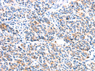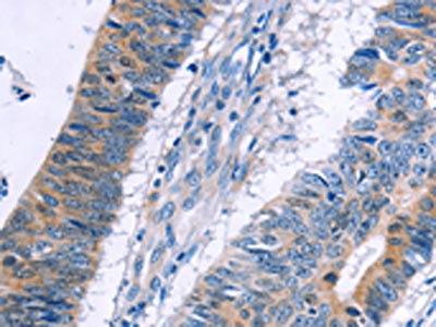 The image on the left is immunohistochemistry of paraffin-embedded Human colon cancer tissue using CSB-PA578770(ERBB3 Antibody) at dilution 1/20, on the right is treated with fusion protein. (Original magnification: ×200)