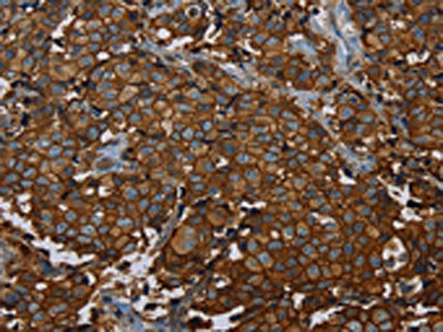 The image on the left is immunohistochemistry of paraffin-embedded Human esophagus cancer tissue using CSB-PA736786(ERBB4 Antibody) at dilution 1/40, on the right is treated with fusion protein. (Original magnification: ×200)