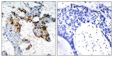 Immunohistochemical analysis of paraffin-embedded human breast carcinoma tissue using Estrogen Receptor-a(Ab-118) Antibody(left) or the same antibody preincubated with blocking peptide(right).