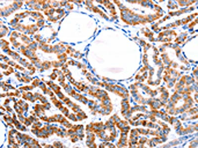 The image on the left is immunohistochemistry of paraffin-embedded Human thyroid cancer tissue using CSB-PA223323(ESR1 Antibody) at dilution 1/76, on the right is treated with synthetic peptide. (Original magnification: ×200)