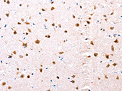 The image on the left is immunohistochemistry of paraffin-embedded Human brain tissue using CSB-PA223323(ESR1 Antibody) at dilution 1/76, on the right is treated with synthetic peptide. (Original magnification: ×200)