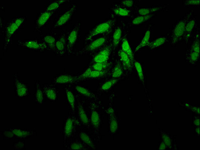 Immunofluorescence staining of Hela cells with CSB-PA007833LA01HU at 1:100, counter-stained with DAPI. The cells were fixed in 4% formaldehyde, permeabilized using 0.2% Triton X-100 and blocked in 10% normal Goat Serum. The cells were then incubated with the antibody overnight at 4°C. The secondary antibody was Alexa Fluor 488-congugated AffiniPure Goat Anti-Rabbit IgG(H+L).
