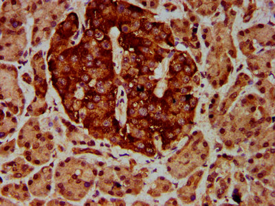 IHC image of CSB-PA007859LA01HU diluted at 1:600 and staining in paraffin-embedded human pancreatic tissue performed on a Leica BondTM system. After dewaxing and hydration, antigen retrieval was mediated by high pressure in a citrate buffer (pH 6.0). Section was blocked with 10% normal goat serum 30min at RT. Then primary antibody (1% BSA) was incubated at 4°C overnight. The primary is detected by a biotinylated secondary antibody and visualized using an HRP conjugated SP system.
