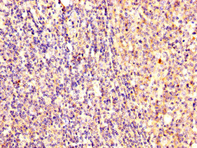 IHC image of CSB-PA02159A0Rb diluted at 1:300 and staining in paraffin-embedded human tonsil tissue performed on a Leica BondTM system. After dewaxing and hydration, antigen retrieval was mediated by high pressure in a citrate buffer (pH 6.0). Section was blocked with 10% normal goat serum 30min at RT. Then primary antibody (1% BSA) was incubated at 4°C overnight. The primary is detected by a biotinylated secondary antibody and visualized using an HRP conjugated SP system.