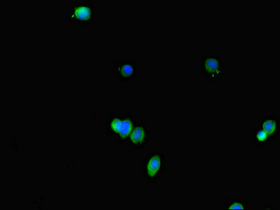 Immunofluorescent analysis of HepG2 cells using CSB-PA007956LA01HU at dilution of 1:100 and Alexa Fluor 488-congugated AffiniPure Goat Anti-Rabbit IgG(H+L)