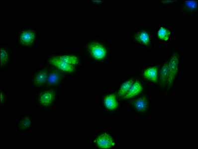 Immunofluorescence staining of HepG2 cells with CSB-PA889122LA01HU at 1:133, counter-stained with DAPI. The cells were fixed in 4% formaldehyde, permeabilized using 0.2% Triton X-100 and blocked in 10% normal Goat Serum. The cells were then incubated with the antibody overnight at 4°C. The secondary antibody was Alexa Fluor 488-congugated AffiniPure Goat Anti-Rabbit IgG(H+L).