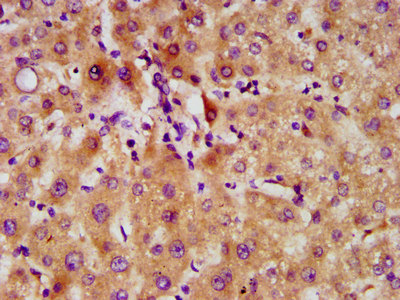 IHC image of CSB-PA816901LA01HU diluted at 1:500 and staining in paraffin-embedded human liver tissue performed on a Leica BondTM system. After dewaxing and hydration, antigen retrieval was mediated by high pressure in a citrate buffer (pH 6.0). Section was blocked with 10% normal goat serum 30min at RT. Then primary antibody (1% BSA) was incubated at 4°C overnight. The primary is detected by a biotinylated secondary antibody and visualized using an HRP conjugated SP system.