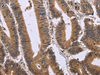 The image on the left is immunohistochemistry of paraffin-embedded Human colon cancer tissue using CSB-PA015538(FAM3B Antibody) at dilution 1/30, on the right is treated with fusion protein. (Original magnification: ×200)