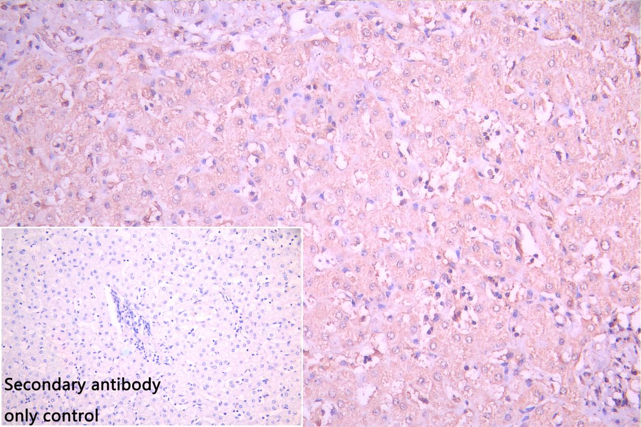 IHC image of CSB-PA897492LA01HU diluted at 1:50 and staining in paraffin-embedded human Liver tissue performed on a Leica BondTM system. After dewaxing and hydration, antigen retrieval was mediated by high pressure in a citrate buffer (pH 6.0). Section was blocked with 10% normal goat serum 30min at RT. Then primary antibody (1% BSA) was incubated at 4°C overnight. The primary is detected by a Goat anti-rabbit polymer IgG labeled by HRP and visualized using 0.05% DAB. Secondary antibody only control: uses 1% BSA instead of primary antibody