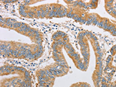 The image on the left is immunohistochemistry of paraffin-embedded Human colon cancer tissue using CSB-PA143333(FARSB Antibody) at dilution 1/20, on the right is treated with fusion protein. (Original magnification: ×200)