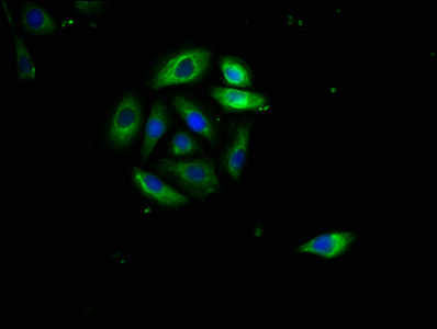 Immunofluorescence staining of A549 cells with CSB-PA06354A0Rb at 1:400, counter-stained with DAPI. The cells were fixed in 4% formaldehyde, permeabilized using 0.2% Triton X-100 and blocked in 10% normal Goat Serum. The cells were then incubated with the antibody overnight at 4°C. The secondary antibody was Alexa Fluor 488-congugated AffiniPure Goat Anti-Rabbit IgG(H+L).