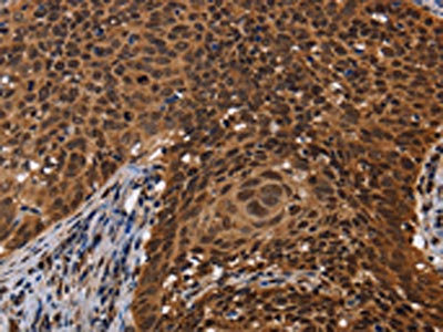 The image on the left is immunohistochemistry of paraffin-embedded Human cervical cancer tissue using CSB-PA730045(FASTKD5 Antibody) at dilution 1/40, on the right is treated with fusion protein. (Original magnification: ×200)