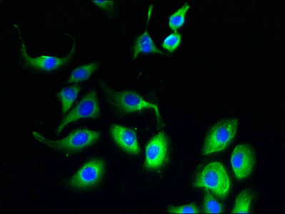 Immunofluorescent analysis of A549 cells using CSB-PA839274LA01HU at dilution of 1:100 and Alexa Fluor 488-congugated AffiniPure Goat Anti-Rabbit IgG(H+L)