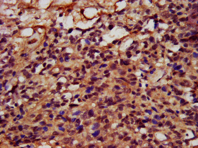 IHC image of CSB-PA839274LA01HU diluted at 1:400 and staining in paraffin-embedded human ovarian cancer performed on a Leica BondTM system. After dewaxing and hydration, antigen retrieval was mediated by high pressure in a citrate buffer (pH 6.0). Section was blocked with 10% normal goat serum 30min at RT. Then primary antibody (1% BSA) was incubated at 4°C overnight. The primary is detected by a biotinylated secondary antibody and visualized using an HRP conjugated SP system.