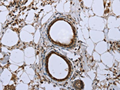 The image on the left is immunohistochemistry of paraffin-embedded Human breast cancer tissue using CSB-PA825632(FBP1 Antibody) at dilution 1/40, on the right is treated with fusion protein. (Original magnification: ×200)
