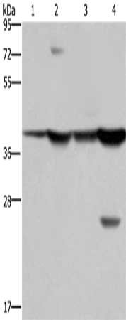 Gel: 8%SDS-PAGE, Lysate: 40 μg, Lane 1-4: Mouse stomach tissue, human fetal liver tissue, MCF7 cells, mouse liver tissue tissue, Primary antibody: CSB-PA825632(FBP1 Antibody) at dilution 1/850, Secondary antibody: Goat anti rabbit IgG at 1/8000 dilution, Exposure time: 10 seconds