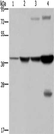 Gel: 8%SDS-PAGE, Lysate: 40 μg, Lane 1-4: Mouse stomach tissue, human fetal liver tissue, MCF7 cells, mouse liver tissue tissue, Primary antibody: CSB-PA056820(FBP1 Antibody) at dilution 1/550, Secondary antibody: Goat anti rabbit IgG at 1/8000 dilution, Exposure time: 10 seconds