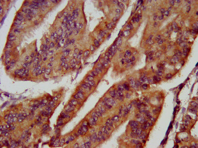 IHC image of CSB-PA822228LA01HU diluted at 1:800 and staining in paraffin-embedded human endometrial cancer performed on a Leica BondTM system. After dewaxing and hydration, antigen retrieval was mediated by high pressure in a citrate buffer (pH 6.0). Section was blocked with 10% normal goat serum 30min at RT. Then primary antibody (1% BSA) was incubated at 4°C overnight. The primary is detected by a biotinylated secondary antibody and visualized using an HRP conjugated SP system.