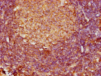 IHC image of CSB-PA02219A0Rb diluted at 1:800 and staining in paraffin-embedded human lymph node tissue performed on a Leica BondTM system. After dewaxing and hydration, antigen retrieval was mediated by high pressure in a citrate buffer (pH 6.0). Section was blocked with 10% normal goat serum 30min at RT. Then primary antibody (1% BSA) was incubated at 4°C overnight. The primary is detected by a biotinylated secondary antibody and visualized using an HRP conjugated SP system.