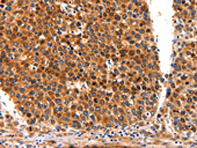 The image on the left is immunohistochemistry of paraffin-embedded Human liver cancer tissue using CSB-PA086441(FGFR1 Antibody) at dilution 1/60, on the right is treated with fusion protein. (Original magnification: ×200)