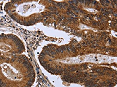 The image on the left is immunohistochemistry of paraffin-embedded Human colon cancer tissue using CSB-PA217817(FGFR1OP Antibody) at dilution 1/50, on the right is treated with fusion protein. (Original magnification: ×200)