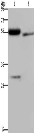 Gel: 8%SDS-PAGE, Lysate: 40 μg, Lane 1-2: Human placenta tissue, Human fetal intestine tissue, Primary antibody: CSB-PA175167(FGL2 Antibody) at dilution 1/450, Secondary antibody: Goat anti rabbit IgG at 1/8000 dilution, Exposure time: 2 minutes