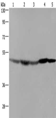 Gel: 8%SDS-PAGE, Lysate: 40 μg, Lane 1-5: Hela cells, mouse liver tissue, Mouse brain tissue, Mouse heart tissue, RAW264.7 cells, Primary antibody: CSB-PA045962(FH Antibody) at dilution 1/600, Secondary antibody: Goat anti rabbit IgG at 1/8000 dilution, Exposure time: 20 seconds