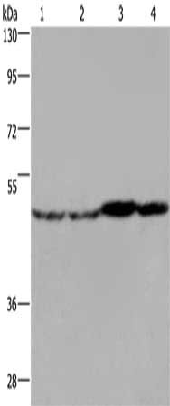 Gel: 8%SDS-PAGE, Lysate: 40 μg, Lane 1-4: Mouse liver tissue, Mouse brain tissue, Mouse heart tissue, RAW264.7 cells, Primary antibody: CSB-PA788032(FH Antibody) at dilution 1/850, Secondary antibody: Goat anti rabbit IgG at 1/8000 dilution, Exposure time: 20 seconds