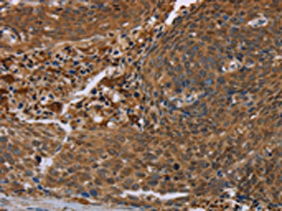 The image on the left is immunohistochemistry of paraffin-embedded Human cervical cancer tissue using CSB-PA247101(FLG Antibody) at dilution 1/20, on the right is treated with synthetic peptide. (Original magnification: ×200)