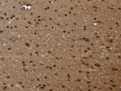 The image on the left is immunohistochemistry of paraffin-embedded Human brain tissue using CSB-PA904028(FLNA Antibody) at dilution 1/50, on the right is treated with fusion protein. (Original magnification: ×200)
