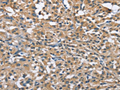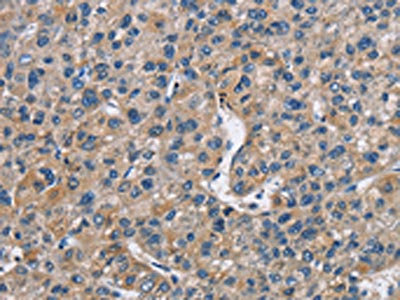 The image on the left is immunohistochemistry of paraffin-embedded Human liver cancer tissue using CSB-PA922469(FLT3 Antibody) at dilution 1/30, on the right is treated with fusion protein. (Original magnification: ×200)