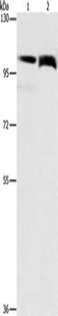 Gel: 6%SDS-PAGE, Lysate: 40 μg, Lane 1-2: Lovo cells, 231 cells, Primary antibody: CSB-PA922469(FLT3 Antibody) at dilution 1/240, Secondary antibody: Goat anti rabbit IgG at 1/8000 dilution, Exposure time: 15 seconds