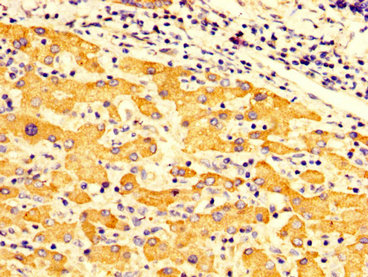 IHC image of CSB-PA008749LA01HU diluted at 1:300 and staining in paraffin-embedded human liver cancer performed on a Leica BondTM system. After dewaxing and hydration, antigen retrieval was mediated by high pressure in a citrate buffer (pH 6.0). Section was blocked with 10% normal goat serum 30min at RT. Then primary antibody (1% BSA) was incubated at 4°C overnight. The primary is detected by a biotinylated secondary antibody and visualized using an HRP conjugated SP system.