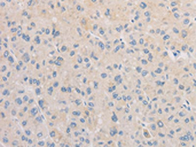 The image on the left is immunohistochemistry of paraffin-embedded Human liver cancer tissue using CSB-PA064938(FNTA Antibody) at dilution 1/30, on the right is treated with fusion protein. (Original magnification: ×200)