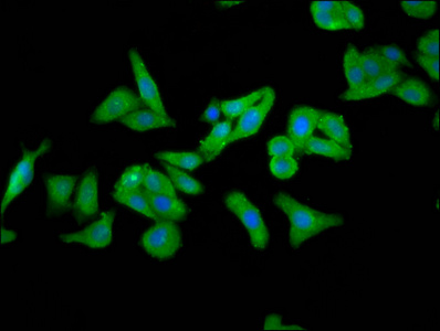 Immunofluorescence staining of HepG2 cells with CSB-PA008784LA01HU at 1:266, counter-stained with DAPI. The cells were fixed in 4% formaldehyde, permeabilized using 0.2% Triton X-100 and blocked in 10% normal Goat Serum. The cells were then incubated with the antibody overnight at 4°C. The secondary antibody was Alexa Fluor 488-congugated AffiniPure Goat Anti-Rabbit IgG(H+L).