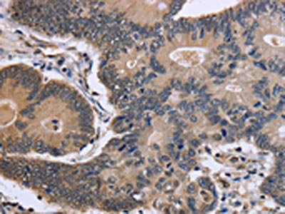 The image is immunohistochemistry of paraffin-embedded Human colon cancer tissue using CSB-PA172178(FSTL1 Antibody) at dilution 1/40. (Original magnification: ×200)