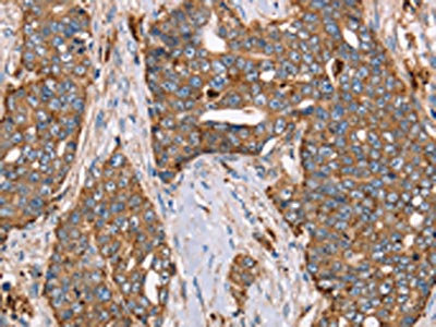 The image on the left is immunohistochemistry of paraffin-embedded Human lung cancer tissue using CSB-PA799040(FUCA1 Antibody) at dilution 1/30, on the right is treated with fusion protein. (Original magnification: ×200)