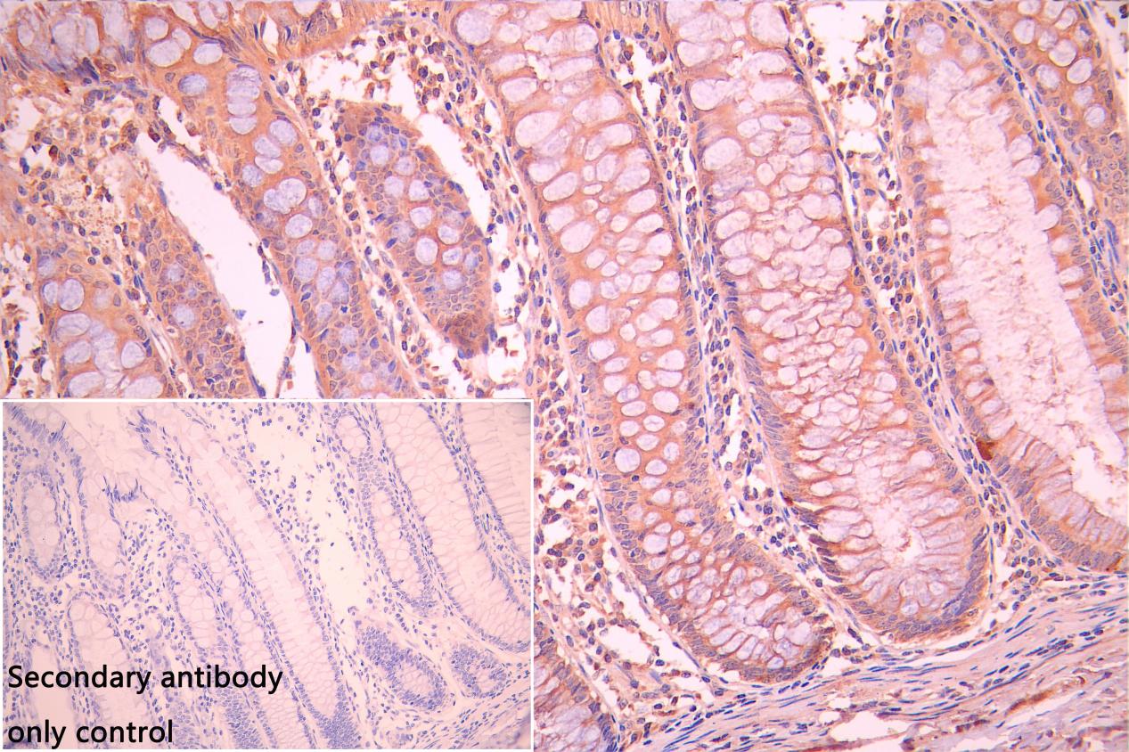IHC image of CSB-PA816886LA01HU diluted at 1:250 and staining in paraffin-embedded human colorectal cancer performed on a Leica BondTM system. After dewaxing and hydration, antigen retrieval was mediated by high pressure in a citrate buffer (pH 6.0). Section was blocked with 10% normal goat serum 30min at RT. Then primary antibody (1% BSA) was incubated at 4°C overnight. The primary is detected by a Goat anti-rabbit polymer IgG labeled by HRP and visualized using 0.05% DAB. Secondary antibody only control: uses 1% BSA instead of primary antibody