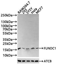Positive WB detected in: RAW264.7 whole cell lysate(30μg), 293 whole cell lysate(30μg), SY5Y whole cell lysate(30μg), Hela whole cell lysate(30μg), MCF7 whole cell lysate(30μg)