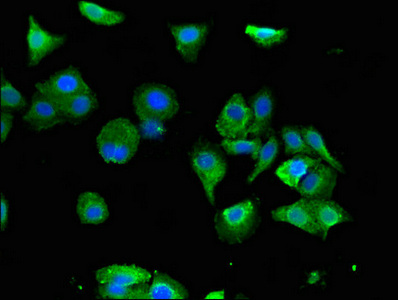Immunofluorescent analysis of HepG2 cells using CSB-PA009087LA01HU at dilution of 1:100 and Alexa Fluor 488-congugated AffiniPure Goat Anti-Rabbit IgG(H+L)