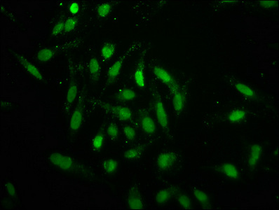 Immunofluorescence staining of Hela cells with CSB-PA010378OA96forHU at 1:2.5, counter-stained with DAPI. The cells were fixed in 4% formaldehyde, permeabilized using 0.2% Triton X-100 and blocked in 10% normal Goat Serum. The cells were then incubated with the antibody overnight at 4°C. The secondary antibody was Alexa Fluor 488-congugated AffiniPure Goat Anti-Rabbit IgG(H+L).
