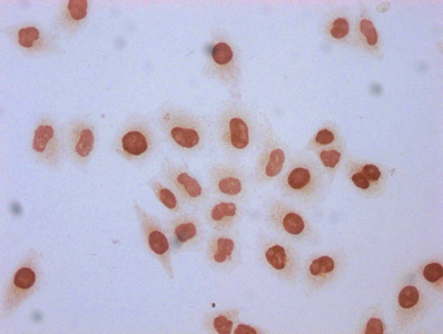 Immunocytochemistry analysis of CSB-PA010378OA96forHU diluted at 1:5 and staining in Hela cells (treated with 30mM sodium butyrate for 4h) performed on a Leica BondTM system. The cells were fixed in 4% formaldehyde, permeabilized using 0.2% Triton X-100 and blocked with 10% normal goat serum 30min at RT. Then primary antibody (1% BSA) was incubated at 4°C overnight. The primary is detected by a biotinylated secondary antibody and visualized using an HRP conjugated SP system.