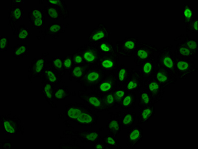Immunofluorescence staining of Hela cells (treated with 30mM sodium butyrate for 4h) with CSB-PA010429OA91forHU at 1:15, counter-stained with DAPI. The cells were fixed in 4% formaldehyde, permeabilized using 0.2% Triton X-100 and blocked in 10% normal Goat Serum. The cells were then incubated with the antibody overnight at 4°C. The secondary antibody was Alexa Fluor 488-congugated AffiniPure Goat Anti-Rabbit IgG(H+L).