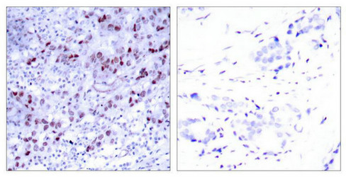 Immunohistochemical analysis of paraffin-embedded human breast carcinoma tissue using GATA1(Ab-142) Antibody(left) or the same antibody preincubated with blocking peptide(right).