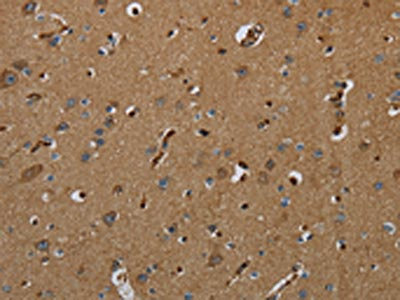 The image on the left is immunohistochemistry of paraffin-embedded Human brain tissue using CSB-PA934669(GBP5 Antibody) at dilution 1/50, on the right is treated with fusion protein. (Original magnification: ×200)