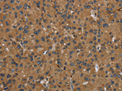 The image on the left is immunohistochemistry of paraffin-embedded Human liver cancer tissue using CSB-PA934669(GBP5 Antibody) at dilution 1/50, on the right is treated with fusion protein. (Original magnification: ×200)