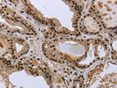 The image on the left is immunohistochemistry of paraffin-embedded Human colon cancer tissue using CSB-PA295309(GCKR Antibody) at dilution 1/50, on the right is treated with fusion protein. (Original magnification: ×200)